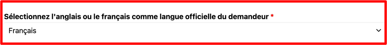 C’est dans cette section qu’il vous sera demandé de sélectionner l’anglais ou le français comme « langue officielle du ou de la demandeur·e ». C’est ici qu’il faut vous assurer de mettre « Français » dans la case.